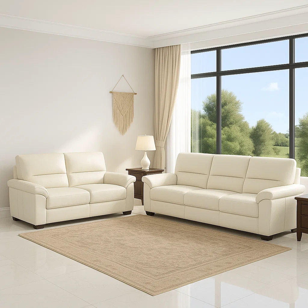 Ensemble de salon 2 pièces 5 places crème en similicuir et bois avec canapé 3 places et canapé 2 places