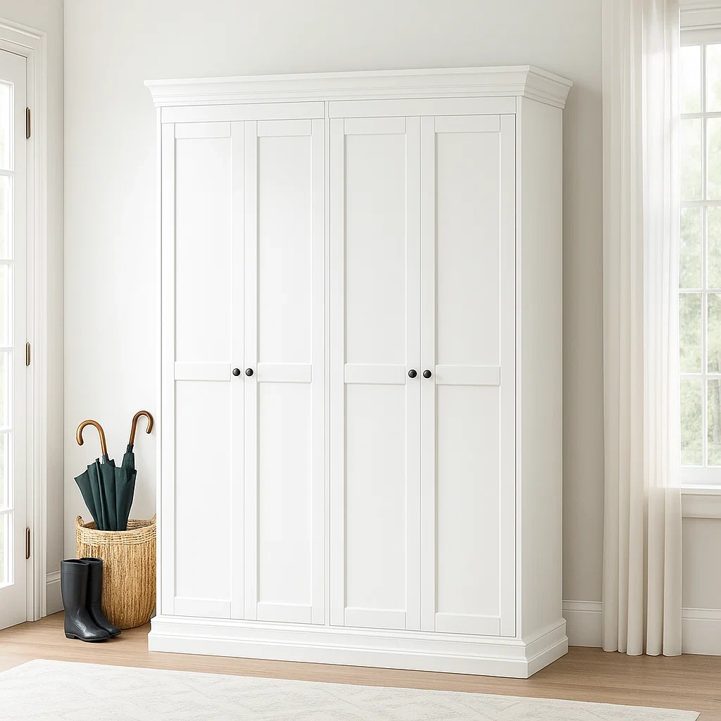 Produit : Armoire de rangement de bureau de 152 x 46 x 198 cm, coloris blanc, en bois MDF, destinée à un usage intérieur.