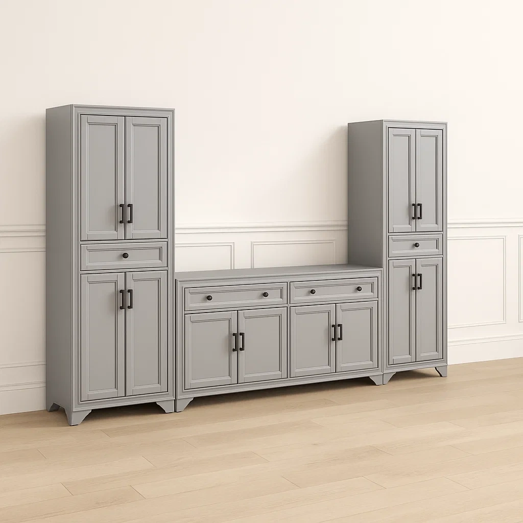 Produit : Ensemble buffet et armoires 276 x 38 x 172 cm, couleur gris, structure principale en MDF, destiné au rangement domestique (séjour, salle à manger, entrée).