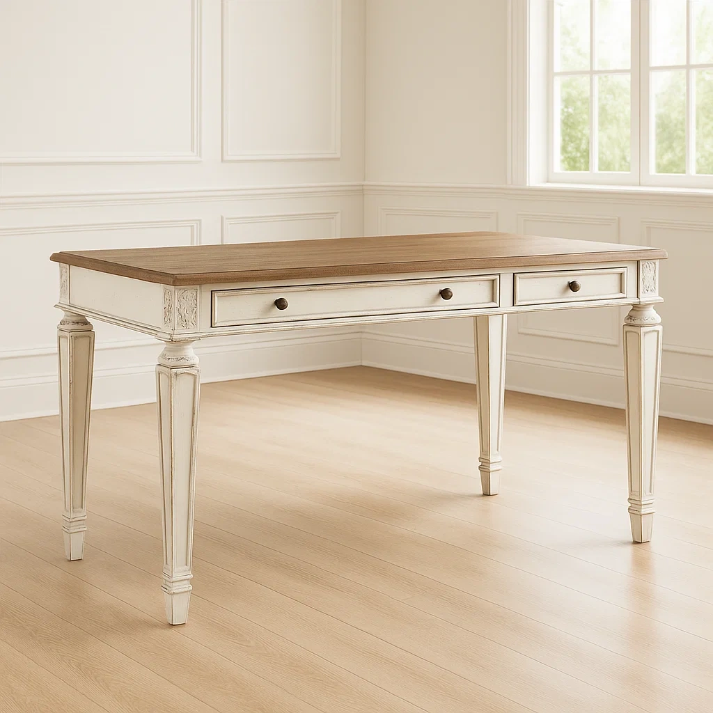 Produit : Bureau rectangulaire 152,4 x 71,1 x 78,7 cm, couleur blanc/bois clair, en bois composite avec rangements intégrés, destiné à un usage domestique ou professionnel.