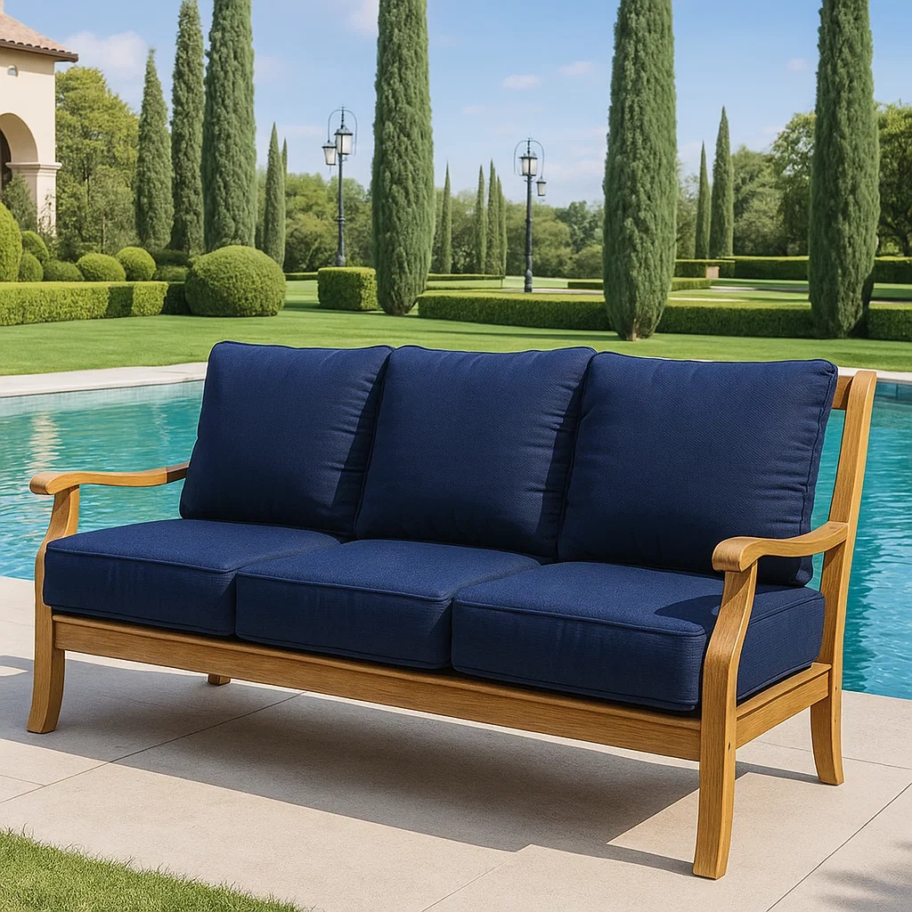 Produit : Canapé d’extérieur conçu pour une utilisation en terrasse ou jardin. Il offre confort et durabilité avec une structure en bois de teck massif et des coussins en mousse.