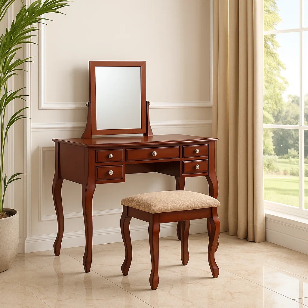 Présentation du produit : Coiffeuse avec miroir rabattable et tabouret rembourré, conçue pour un usage quotidien en chambre ou dressing.