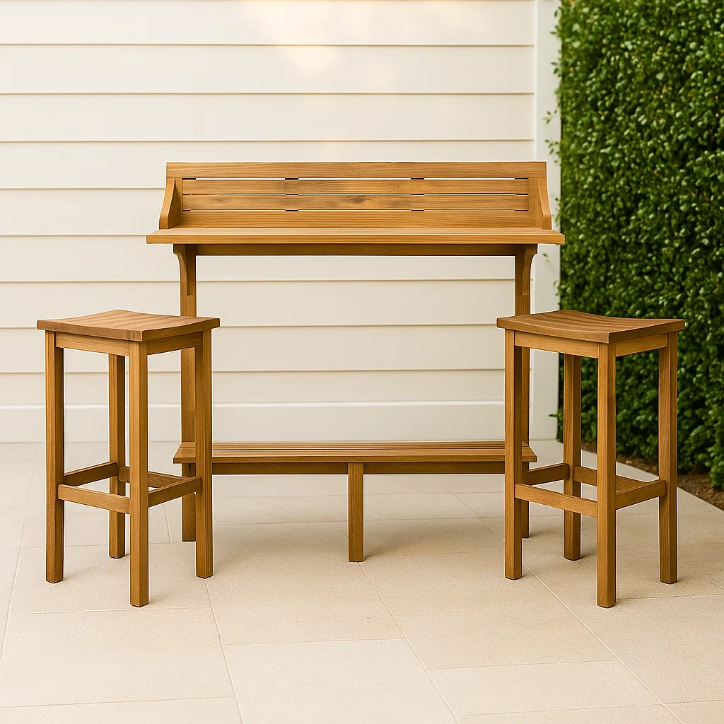 Produit : Ensemble bar d’extérieur 3 pièces, 2 places, couleur bois d’acacia, en bois d’acacia, comprenant 1 table de bar et 2 tabourets hauts, adapté à un usage extérieur.