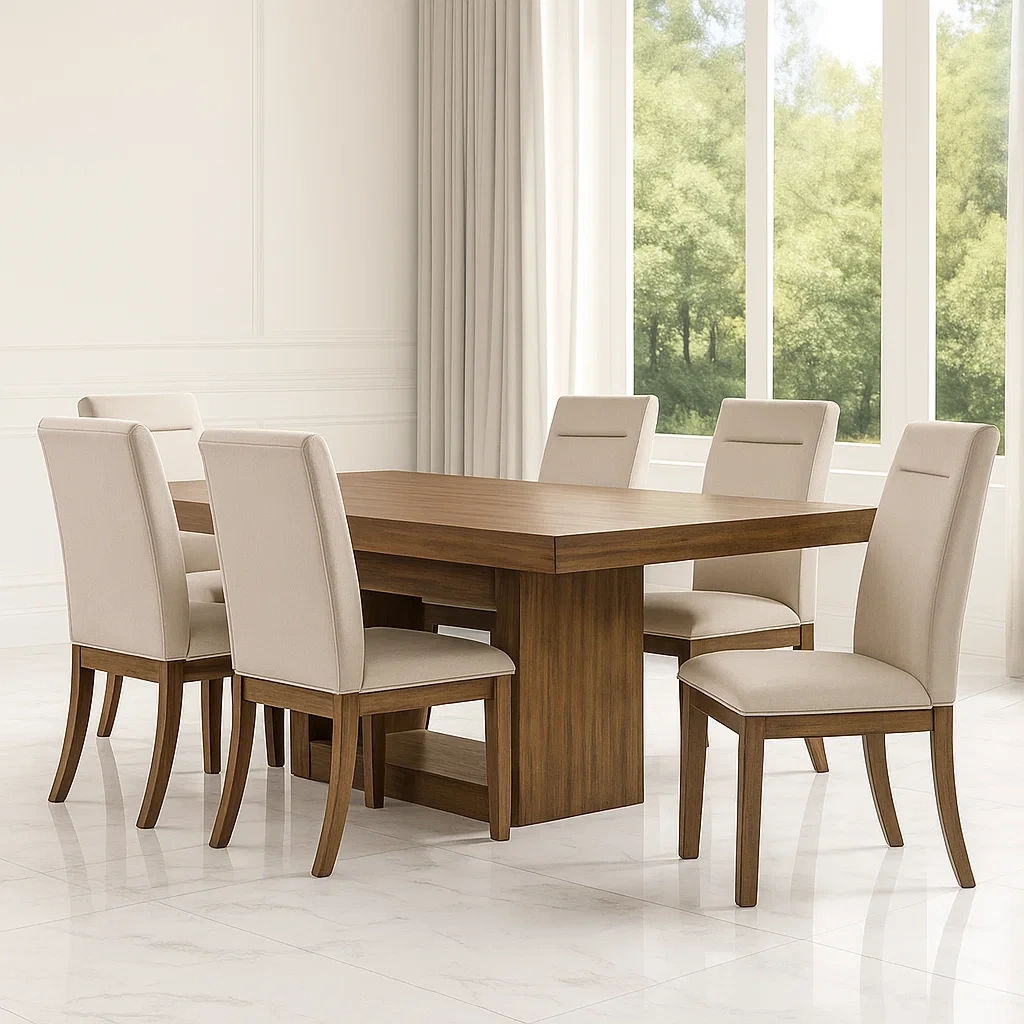 Produit : Ensemble de salle à manger 7 pièces, 6 places, rectangulaire, coloris caramel/beige, en bois massif, comprenant une table et 6 chaises, destiné à un usage domestique.