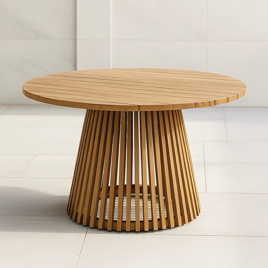 Produit : Table d’extérieur ronde en bois d’acacia, adaptée à un usage résidentiel sur terrasse ou jardin.