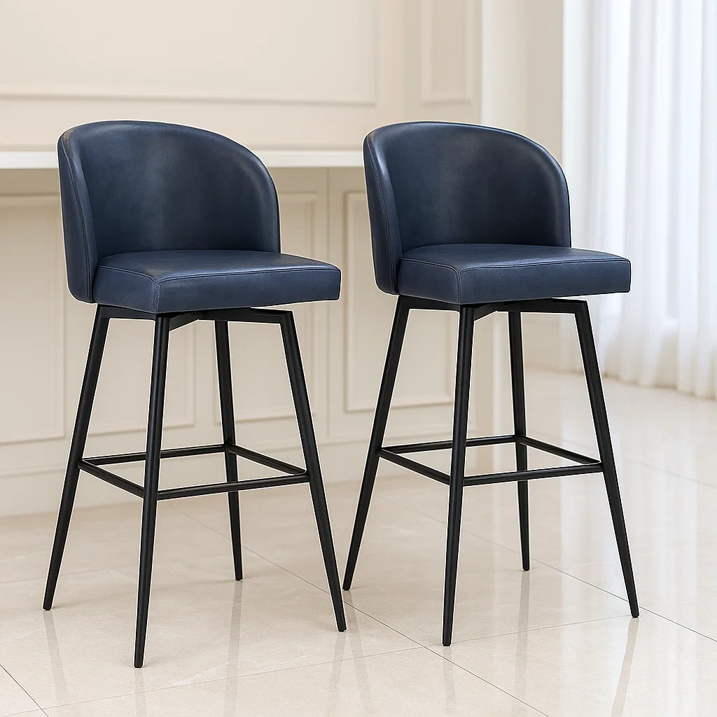 Produit : Lot de 2 tabourets de bar en métal et faux cuir de 49 x 49 x 103 cm, coloris bleu/noir, destinés à un usage intérieur.