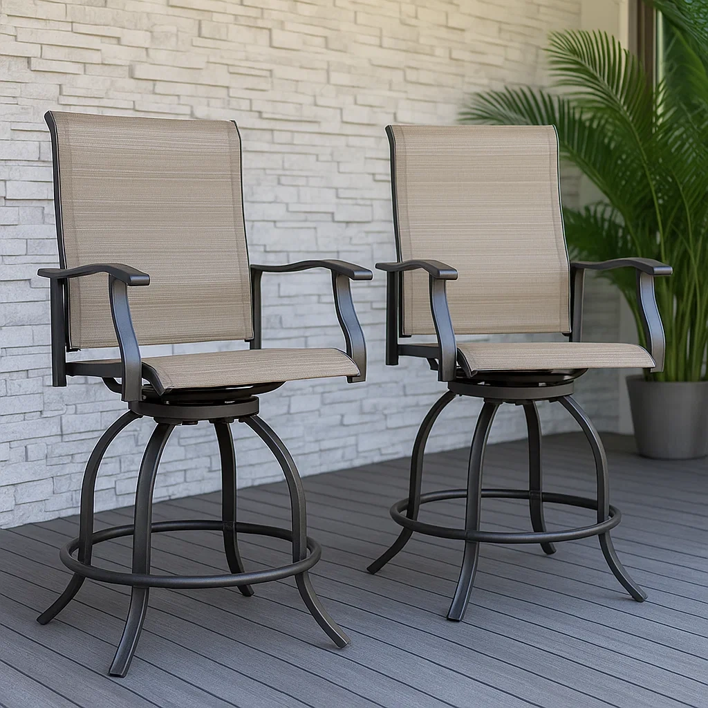 Produit : Tabouret de bar extérieur pivotant avec repose-pieds en acier et assise en sling, conçu pour offrir confort et stabilité dans un cadre extérieur.